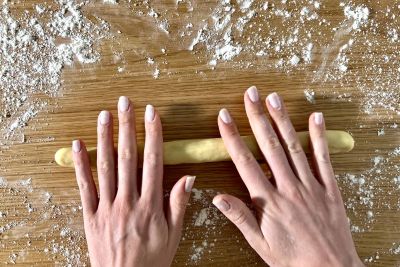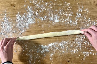- Der fertige Teig wird auch hier in acht gleichgroße Teile aufteilen, die mit den Händen zu Strängen gerollt werden.