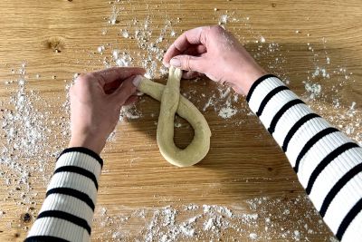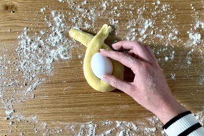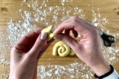 - Den fertigen Teig in acht gleichgroße Teile aufteilen, die einfach mit den Händen zu Strängen gerollt werden. Die beiden Enden der Rolle jeweils etwas verjüngen, weil dies die Hasenohren werden.