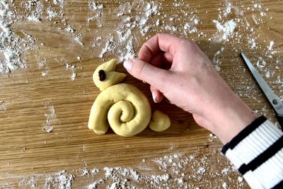 - Die kleine Teigkugel als Schwanz an den Schnecken-Korpus ansetzen. Die Kopfkugel mit den Händen zu einem kegelförmigen Ende formen.