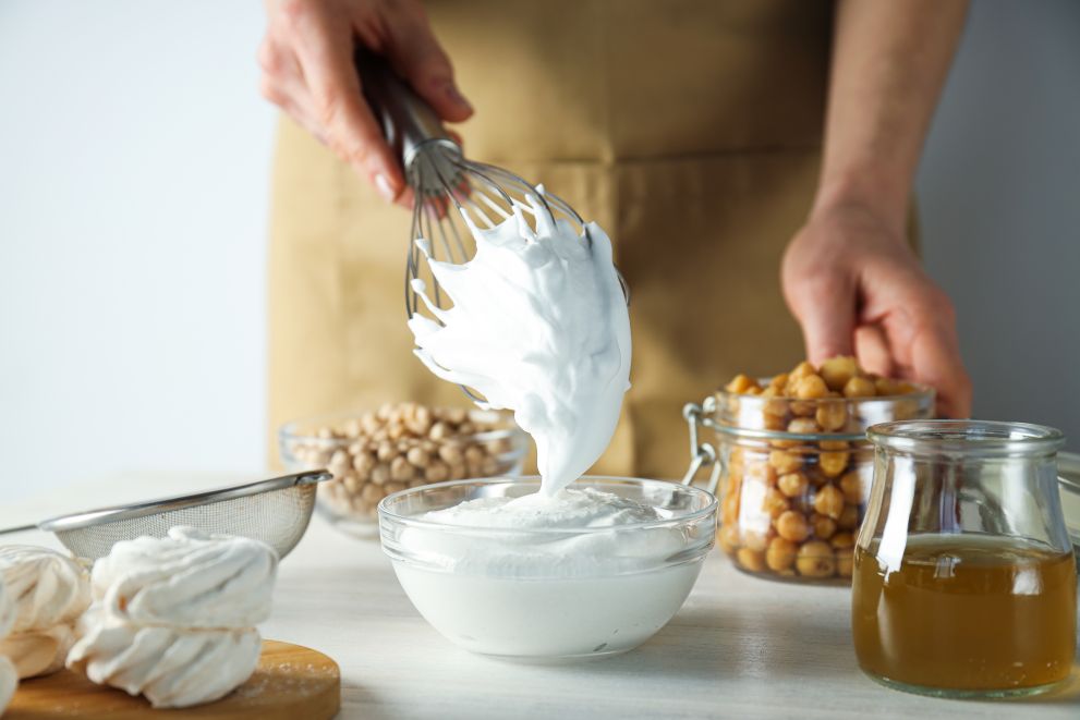 Die Flüssigkeit, die beim Kochen von Bohnen oder Hülsenfrüchten übrigbleibt, hat eine sehr ähnliche Konsistenz wie rohes Eiweiß und eignet sich daher hervorragend als Ersatz. Es ist die gleiche Flüssigkeit, die auch in Kichererbsen- oder Bohnenkonserven enthalten ist.