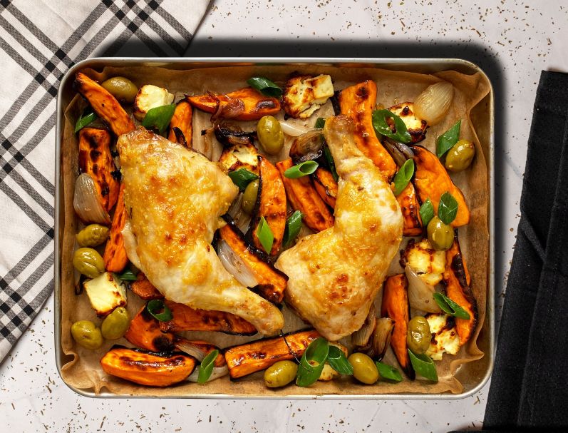 Hähnchenschenkel mit Süßkartoffeln und Feta