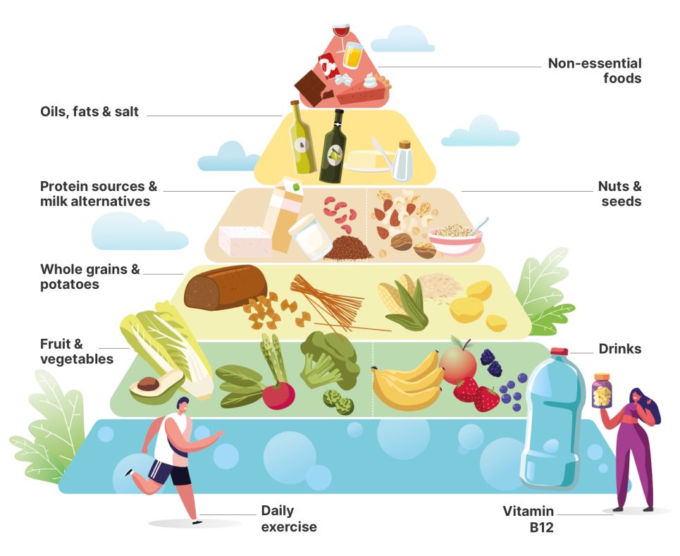 In terms of structure, the vegan food pyramid is much like the conventional omnivore-focused pyramid. Similarly, drinks – preferably water – should make up the largest proportion of our diet, followed by fruit and vegetables, then whole grains and potatoes.