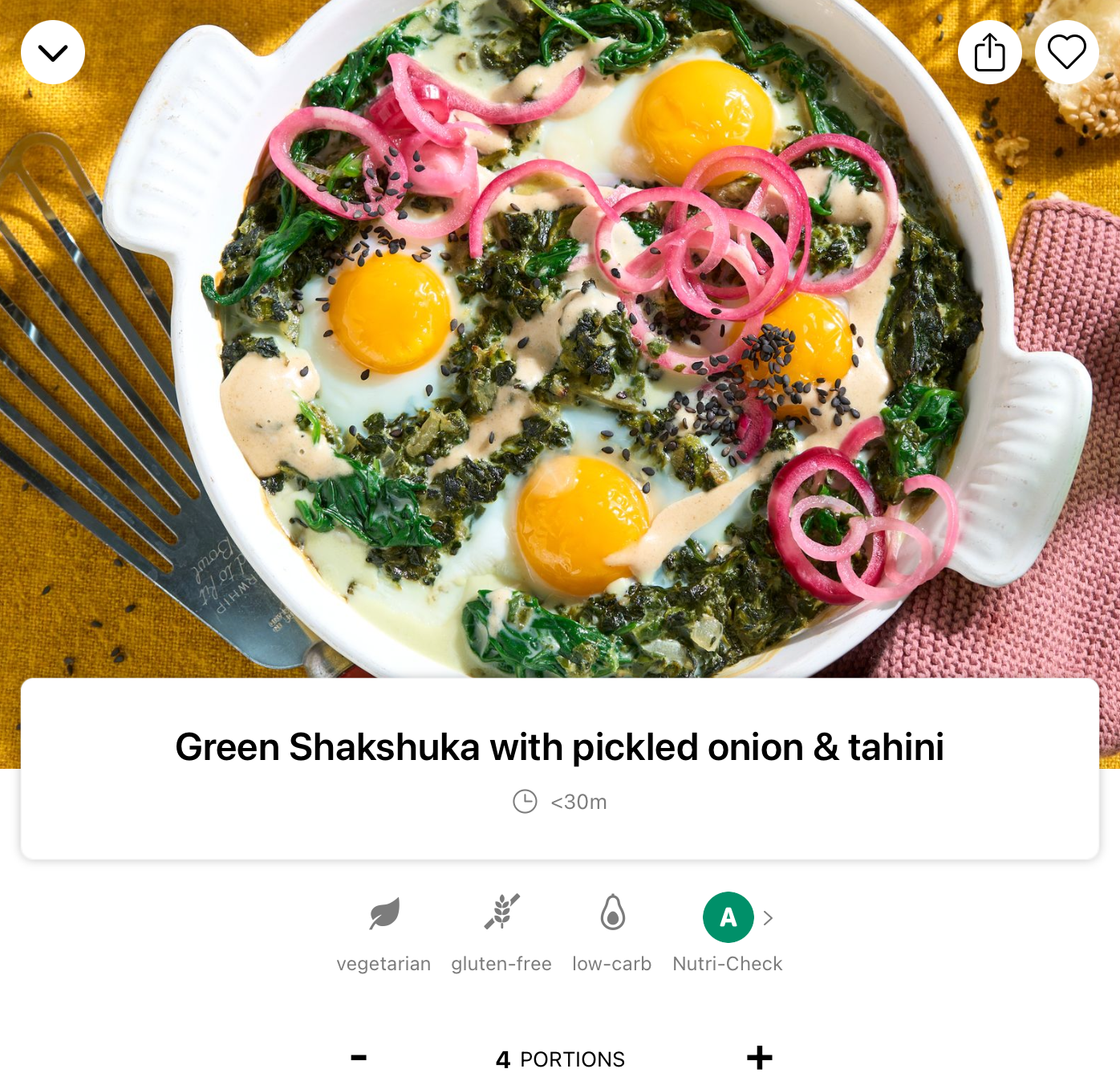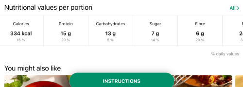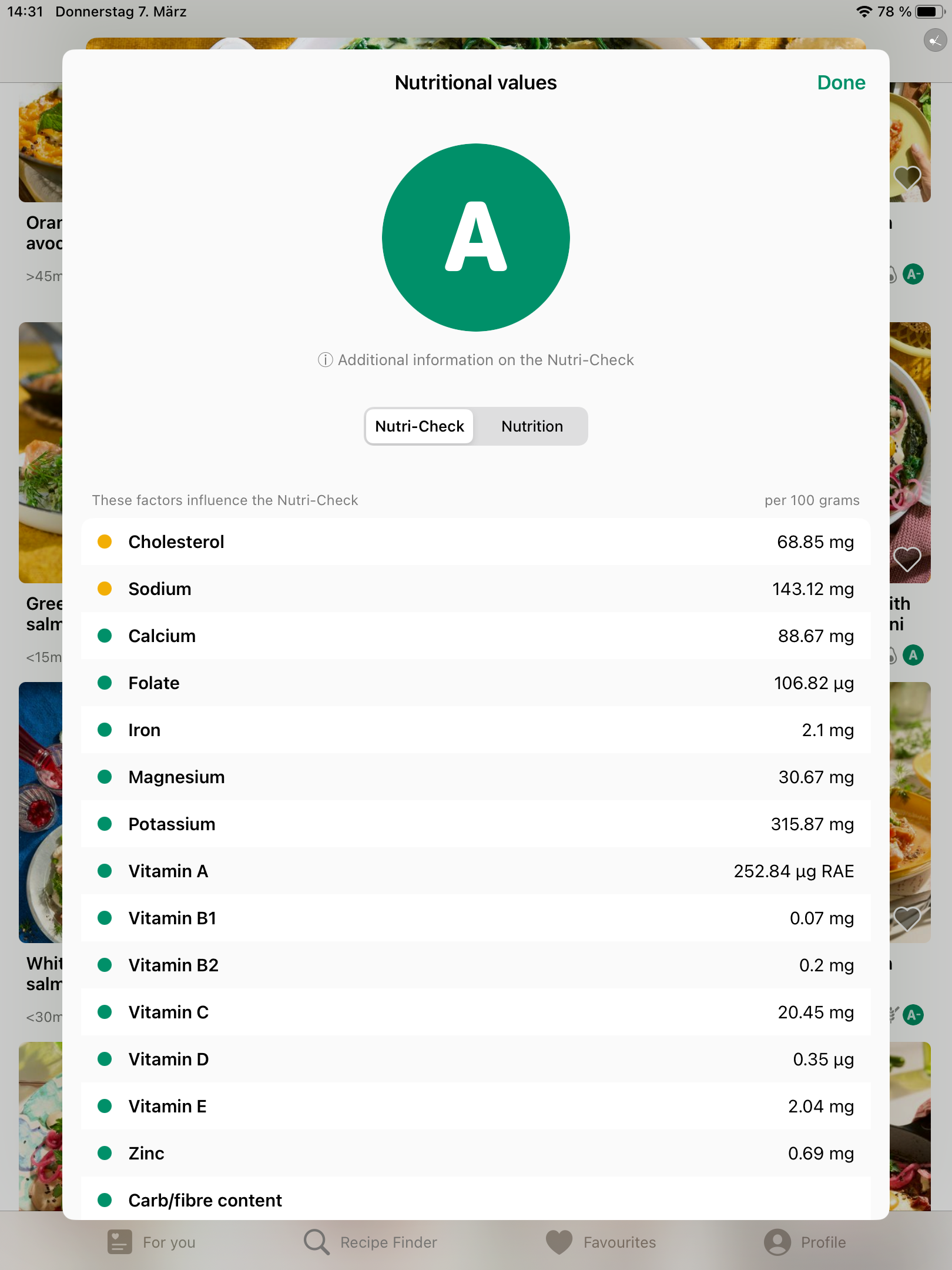 Good to know: Our Nutri-Check button below the recipe picture is a quick reference to the nutritional profiles of individual recipe variants. Letters and colour coding indicate the health value of a dish at a glance. Detailed nutritional information can again be found by tapping on the Nutri-Check button. And we also tell you, of course, exactly what factors are behind our assessment of each dish and what they take into account.